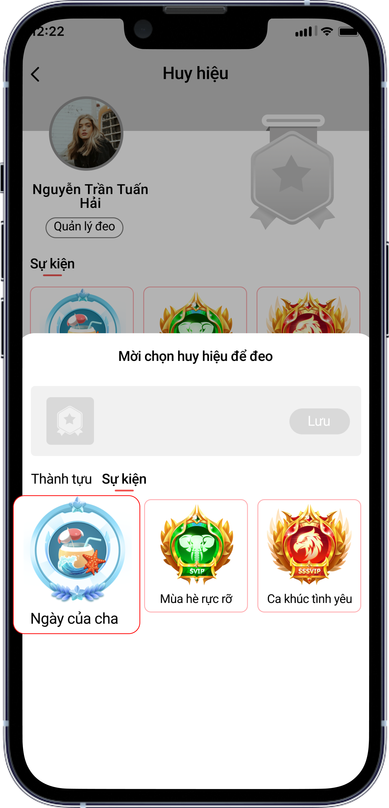 + Chọn 1 huy hiệu bạn muốn đeo, sau đó nhấn “lưu” để hoàn thành việc ghim huy hiệu.